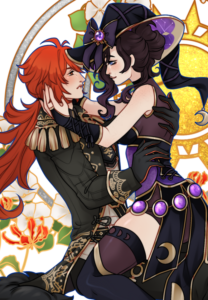 Mavis and Diluc share a history that stretches back to their childhood, a time when their worlds overlapped in innocent curiosity and shared interests. Over the years, Mavis found herself quietly harboring an infatuation for the older, enigmatic nobleman—an affection that grew deeper but was never openly acknowledged. Their bond was forged through mutual respect and a shared sense of justice, but it was during the darkest chapter of Mavis’s life—when she was subjected to cruel experiments by Dottore—that their connection was truly tested. Diluc’s timely intervention to rescue her left a lasting impression, and though he rarely shows overt emotion, he has taken it upon himself to ensure Mavis’s safety, refusing to let her face danger alone. His protective nature hides a complex mix of guilt, care, and unresolved feelings.Mona: