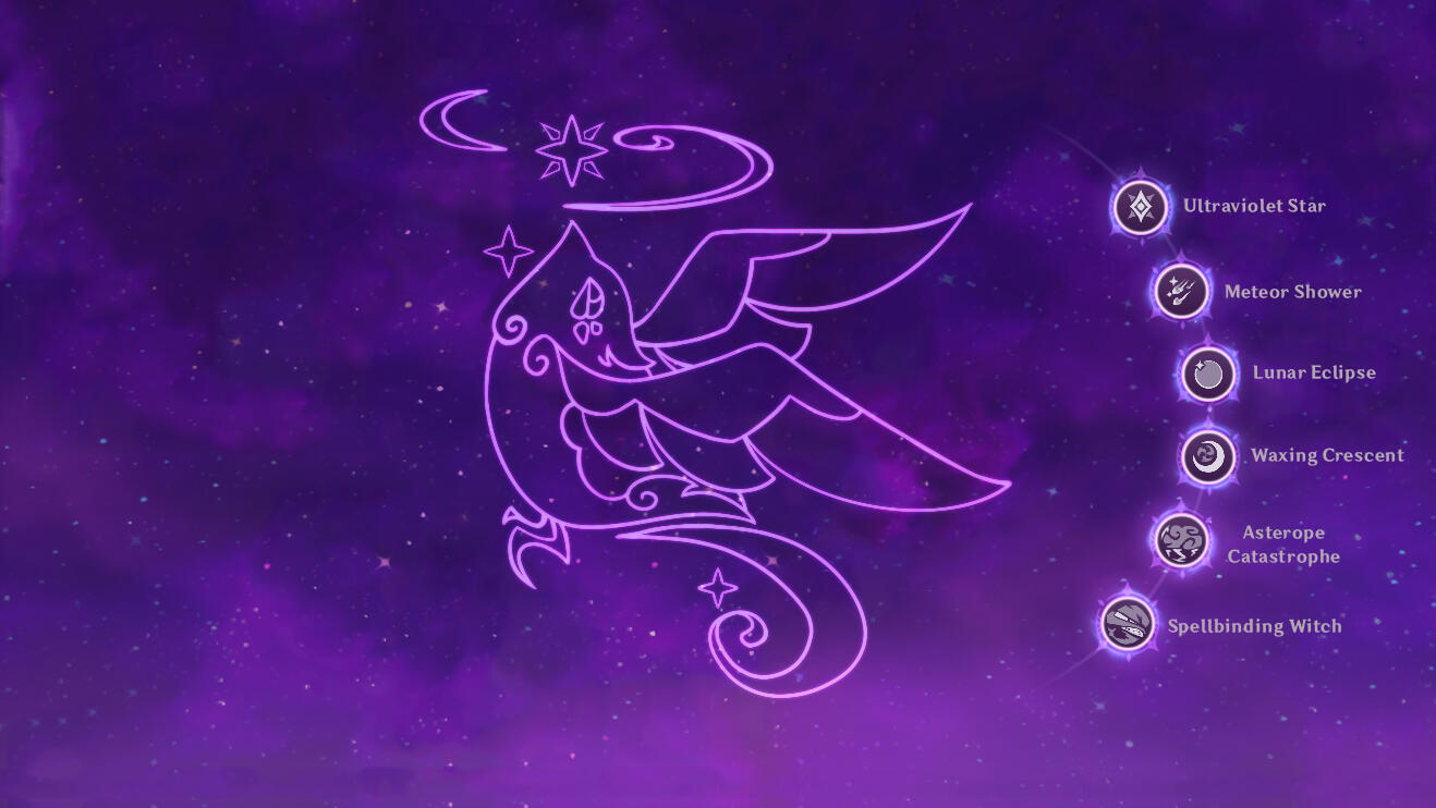 Level I - Ultraviolet Star.Mavis regenerates 3 Energy for every opponent hit while holding Moonlight Sonata.A maximum of 10 Energy can be regenerated in this manner at any one time.Level II - Meteor Shower.Holding Moonlight Sonata has the following effects:Increases ATK by 15%.Increases Mavis’s resistance to interruption.Level III - Lunar Eclipse.Increases the Level of Eclipse of the Moon by 3.Maximum upgrade level is 15.Level IV - Waxing Crescent.